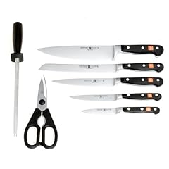 The Classic cutlery line bears all the traits that Wüsthof knives are known for: impeccable construction, incredible sharpness, and long-lasting durability. Each Classic knife is precision-forged--blade, bolster, and tang--from a single piece of high-carbon, stain-resistant steel. The blade is tested by lasers and honed by hand, with computer-controlled front-to-back tapering, grinding, and polishing. A visible full tang--the blade's shaft runs the entire length of the handle--ensures excellent balance and strength. Classic handles are molded from a durable black synthetic called Hostaform-C with traditional triple riveting. The knives promise a lifetime of hard-working companionship in the kitchen. This Wüsthof Classic 8 piece block set is a great way to jumpstart your cutlery collection or begin overhauling your old set of knives. Designed to meet the most popular cutting demands, the set includes an 8" Cooks knife for chopping, and a 3-1/2-inch paring knife for coring, trimming, and peeling, 4.5" Utility knife for slicing and peeling. This sets also includes a 8" bread knife, 6" sandwich knife, kitchen shears. Wusthof also includes a 9-inch sharpening steel and an attractive oak block with a total of 17 slots so you can add specialty knives or your old favorites. Classic knives, though safe in the dishwasher, should be washed by hand for best results.